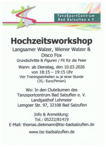 Ein spezielles Angebot möchte das Tanzsportcentrum Bad Salzuflen e.V. angehenden Hochzeitspaaren machen. Ab Dienstag, den 10. März 2026 beginnt ein Workshop Hochzeitstanz. Hier werden in der Zeit von 18:15-19:15 Uhr die Grundschritte und einfache Figuren der beliebten Tänze Wiener Walzer, Langsamer Walzer und Disco Fox kompakt vermittelt. Selbstverständlich sind auch alle anderen Interessierten gerne willkommen. Der Workshop beinhaltet vier Trainingseinheiten zu je einer Stunde und findet in der Trainingsstätte des Tanzsportcentrums, Landgasthof Lehmeier, Lemgoer Strasse 97, 32108 Bad Salzuflen unter der Leitung von Björn Hollberg statt. Die Kosten des Workshops belaufen sich auf 35,- Euro/Person.