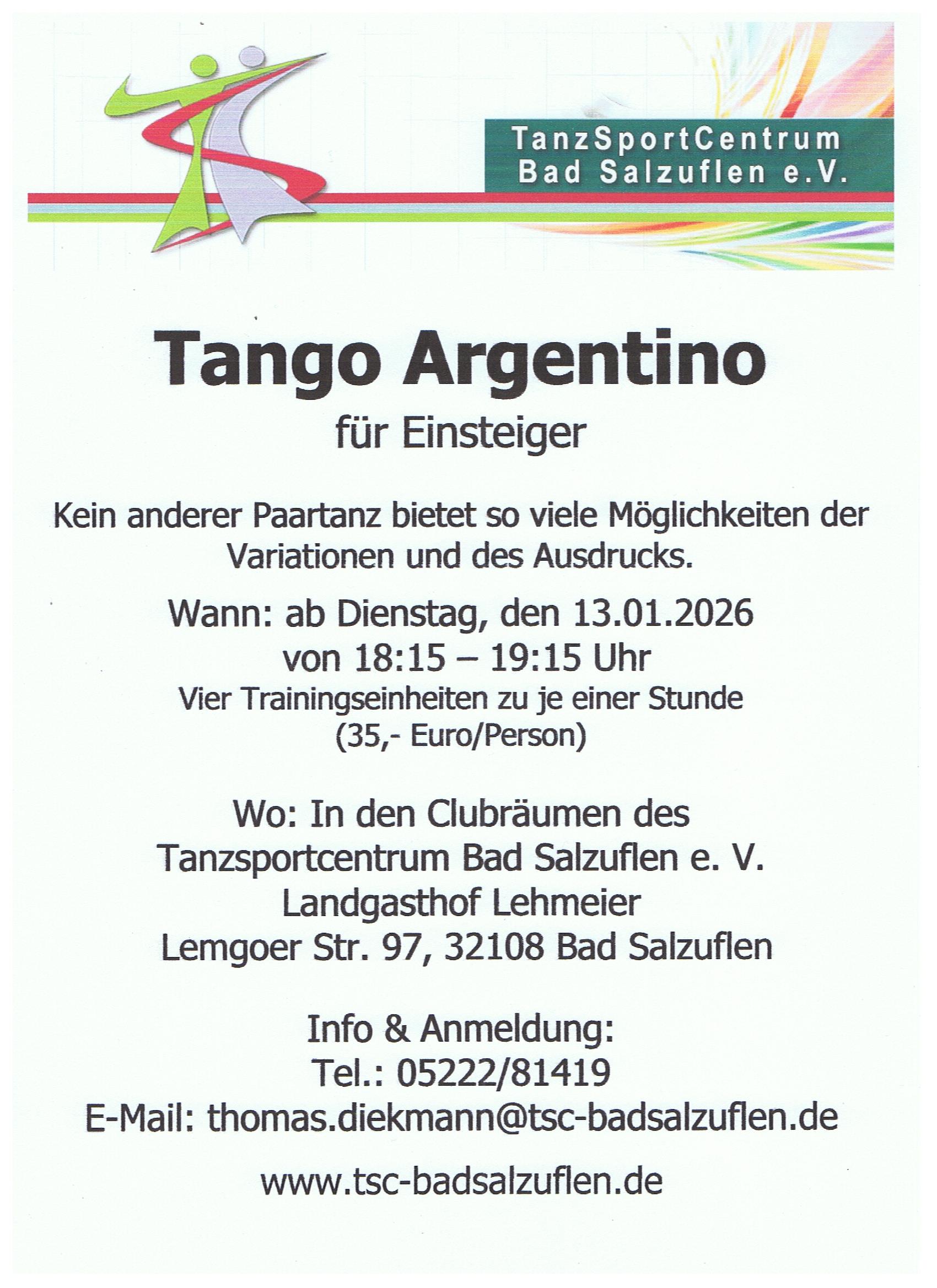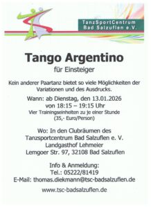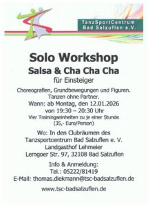 Mit dem Tanzsportcentrum Bad Salzuflen e.V. fit ins neue Jahr. Ab Montag, den 12. Januar 2026 beginnt ein Solo-Workshop Lateinamerikanische Tänze. Hier werden in der Zeit von 19:30-20:30 Uhr die Grundbewegungen und Figuren der Lateinamerikanischen Tänze Cha Cha Cha und Salsa ohne Partner vermittelt. Neben kleinen Choreografien wird auch auf Körperbewegung, Musikalität und Technikelemente eingegangen. Für die Freunde des Tangos startet ab Dienstag, den 13. Januar 2026 von 18:15-19:15 Uhr ein Workshop Tango Argentino für Einsteiger. Kein anderer Paartanz bietet so viele Möglichkeiten der Variationen und des Ausdrucks. Der argentinische Tango kennt keine festen Schrittfolgen. Es sind keine Vorkenntnisse erforderlich. Die Workshops beinhalten vier Trainingseinheiten zu je einer Stunde und finden in der Trainingsstätte des Tanzsportcentrums, Landgasthof Lehmeier, Lemgoer Strasse 97, 32108 Bad Salzuflen unter der Leitung von Brigitte Kessel-Döhle (montags) und Björn Hollberg (dienstags) statt. Die Kosten pro Workshop belaufen sich auf 35,- Euro/Person.